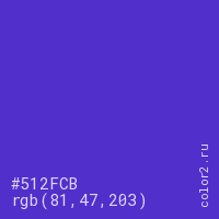 Цвет #512FCB в цветовой модели RGB обозначается тремя октетами (81, 47, 203) в десятичном формате и #512FCB в шестнадцатиричном (hex) формате, которые являются интенсивностью красного 81 (hex 51), интенсивность зелёного 47 (hex 2F) и интенсивность синего 203 (hex CB).