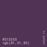 Цвет #513355 в цветовой модели RGB обозначается тремя октетами (81, 51, 85) в десятичном формате и #513355 в шестнадцатиричном (hex) формате, которые являются интенсивностью красного 81 (hex 51), интенсивность зелёного 51 (hex 33) и интенсивность синего 85 (hex 55).