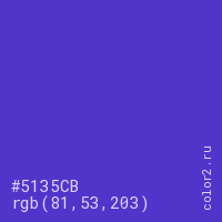 Цвет #5135CB в цветовой модели RGB обозначается тремя октетами (81, 53, 203) в десятичном формате и #5135CB в шестнадцатиричном (hex) формате, которые являются интенсивностью красного 81 (hex 51), интенсивность зелёного 53 (hex 35) и интенсивность синего 203 (hex CB).