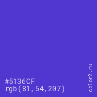 Цвет #5136CF в цветовой модели RGB обозначается тремя октетами (81, 54, 207) в десятичном формате и #5136CF в шестнадцатиричном (hex) формате, которые являются интенсивностью красного 81 (hex 51), интенсивность зелёного 54 (hex 36) и интенсивность синего 207 (hex CF).