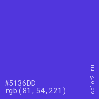Цвет #5136DD в цветовой модели RGB обозначается тремя октетами (81, 54, 221) в десятичном формате и #5136DD в шестнадцатиричном (hex) формате, которые являются интенсивностью красного 81 (hex 51), интенсивность зелёного 54 (hex 36) и интенсивность синего 221 (hex DD).