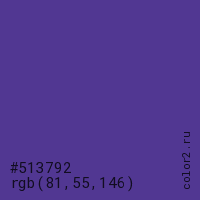 Цвет #513792 в цветовой модели RGB обозначается тремя октетами (81, 55, 146) в десятичном формате и #513792 в шестнадцатиричном (hex) формате, которые являются интенсивностью красного 81 (hex 51), интенсивность зелёного 55 (hex 37) и интенсивность синего 146 (hex 92).