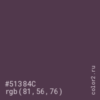 Цвет #51384C в цветовой модели RGB обозначается тремя октетами (81, 56, 76) в десятичном формате и #51384C в шестнадцатиричном (hex) формате, которые являются интенсивностью красного 81 (hex 51), интенсивность зелёного 56 (hex 38) и интенсивность синего 76 (hex 4C).
