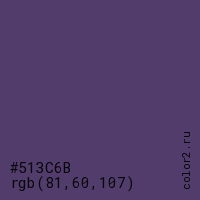Цвет #513C6B в цветовой модели RGB обозначается тремя октетами (81, 60, 107) в десятичном формате и #513C6B в шестнадцатиричном (hex) формате, которые являются интенсивностью красного 81 (hex 51), интенсивность зелёного 60 (hex 3C) и интенсивность синего 107 (hex 6B).