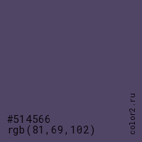 Цвет #514566 в цветовой модели RGB обозначается тремя октетами (81, 69, 102) в десятичном формате и #514566 в шестнадцатиричном (hex) формате, которые являются интенсивностью красного 81 (hex 51), интенсивность зелёного 69 (hex 45) и интенсивность синего 102 (hex 66).