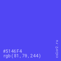 Цвет #5146F4 в цветовой модели RGB обозначается тремя октетами (81, 70, 244) в десятичном формате и #5146F4 в шестнадцатиричном (hex) формате, которые являются интенсивностью красного 81 (hex 51), интенсивность зелёного 70 (hex 46) и интенсивность синего 244 (hex F4).