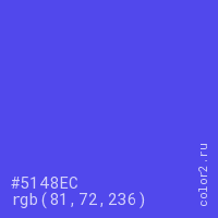 Цвет #5148EC в цветовой модели RGB обозначается тремя октетами (81, 72, 236) в десятичном формате и #5148EC в шестнадцатиричном (hex) формате, которые являются интенсивностью красного 81 (hex 51), интенсивность зелёного 72 (hex 48) и интенсивность синего 236 (hex EC).