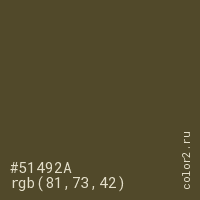 Цвет #51492A в цветовой модели RGB обозначается тремя октетами (81, 73, 42) в десятичном формате и #51492A в шестнадцатиричном (hex) формате, которые являются интенсивностью красного 81 (hex 51), интенсивность зелёного 73 (hex 49) и интенсивность синего 42 (hex 2A).