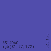 Цвет #514DAC в цветовой модели RGB обозначается тремя октетами (81, 77, 172) в десятичном формате и #514DAC в шестнадцатиричном (hex) формате, которые являются интенсивностью красного 81 (hex 51), интенсивность зелёного 77 (hex 4D) и интенсивность синего 172 (hex AC).