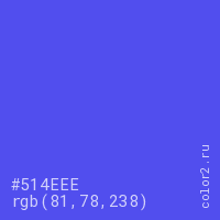 Цвет #514EEE в цветовой модели RGB обозначается тремя октетами (81, 78, 238) в десятичном формате и #514EEE в шестнадцатиричном (hex) формате, которые являются интенсивностью красного 81 (hex 51), интенсивность зелёного 78 (hex 4E) и интенсивность синего 238 (hex EE).