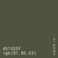 Цвет #51533F в цветовой модели RGB обозначается тремя октетами (81, 83, 63) в десятичном формате и #51533F в шестнадцатиричном (hex) формате, которые являются интенсивностью красного 81 (hex 51), интенсивность зелёного 83 (hex 53) и интенсивность синего 63 (hex 3F).