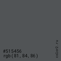 Цвет #515456 в цветовой модели RGB обозначается тремя октетами (81, 84, 86) в десятичном формате и #515456 в шестнадцатиричном (hex) формате, которые являются интенсивностью красного 81 (hex 51), интенсивность зелёного 84 (hex 54) и интенсивность синего 86 (hex 56).