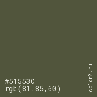 Цвет #51553C в цветовой модели RGB обозначается тремя октетами (81, 85, 60) в десятичном формате и #51553C в шестнадцатиричном (hex) формате, которые являются интенсивностью красного 81 (hex 51), интенсивность зелёного 85 (hex 55) и интенсивность синего 60 (hex 3C).