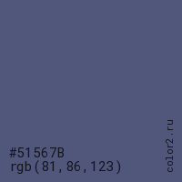 Цвет #51567B в цветовой модели RGB обозначается тремя октетами (81, 86, 123) в десятичном формате и #51567B в шестнадцатиричном (hex) формате, которые являются интенсивностью красного 81 (hex 51), интенсивность зелёного 86 (hex 56) и интенсивность синего 123 (hex 7B).