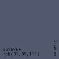 Цвет #51596F в цветовой модели RGB обозначается тремя октетами (81, 89, 111) в десятичном формате и #51596F в шестнадцатиричном (hex) формате, которые являются интенсивностью красного 81 (hex 51), интенсивность зелёного 89 (hex 59) и интенсивность синего 111 (hex 6F).