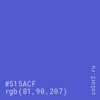 Цвет #515ACF в цветовой модели RGB обозначается тремя октетами (81, 90, 207) в десятичном формате и #515ACF в шестнадцатиричном (hex) формате, которые являются интенсивностью красного 81 (hex 51), интенсивность зелёного 90 (hex 5A) и интенсивность синего 207 (hex CF).