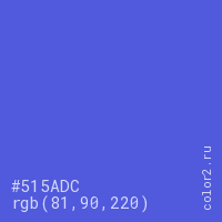 Цвет #515ADC в цветовой модели RGB обозначается тремя октетами (81, 90, 220) в десятичном формате и #515ADC в шестнадцатиричном (hex) формате, которые являются интенсивностью красного 81 (hex 51), интенсивность зелёного 90 (hex 5A) и интенсивность синего 220 (hex DC).