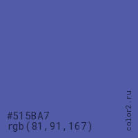 Цвет #515BA7 в цветовой модели RGB обозначается тремя октетами (81, 91, 167) в десятичном формате и #515BA7 в шестнадцатиричном (hex) формате, которые являются интенсивностью красного 81 (hex 51), интенсивность зелёного 91 (hex 5B) и интенсивность синего 167 (hex A7).