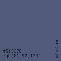 Цвет #515C7B в цветовой модели RGB обозначается тремя октетами (81, 92, 123) в десятичном формате и #515C7B в шестнадцатиричном (hex) формате, которые являются интенсивностью красного 81 (hex 51), интенсивность зелёного 92 (hex 5C) и интенсивность синего 123 (hex 7B).