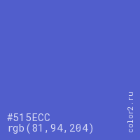 Цвет #515ECC в цветовой модели RGB обозначается тремя октетами (81, 94, 204) в десятичном формате и #515ECC в шестнадцатиричном (hex) формате, которые являются интенсивностью красного 81 (hex 51), интенсивность зелёного 94 (hex 5E) и интенсивность синего 204 (hex CC).