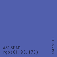 Цвет #515FAD в цветовой модели RGB обозначается тремя октетами (81, 95, 173) в десятичном формате и #515FAD в шестнадцатиричном (hex) формате, которые являются интенсивностью красного 81 (hex 51), интенсивность зелёного 95 (hex 5F) и интенсивность синего 173 (hex AD).