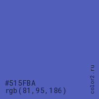Цвет #515FBA в цветовой модели RGB обозначается тремя октетами (81, 95, 186) в десятичном формате и #515FBA в шестнадцатиричном (hex) формате, которые являются интенсивностью красного 81 (hex 51), интенсивность зелёного 95 (hex 5F) и интенсивность синего 186 (hex BA).