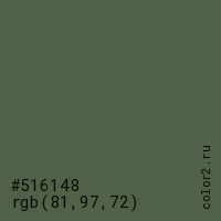 Цвет #516148 в цветовой модели RGB обозначается тремя октетами (81, 97, 72) в десятичном формате и #516148 в шестнадцатиричном (hex) формате, которые являются интенсивностью красного 81 (hex 51), интенсивность зелёного 97 (hex 61) и интенсивность синего 72 (hex 48).