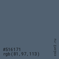 Цвет #516171 в цветовой модели RGB обозначается тремя октетами (81, 97, 113) в десятичном формате и #516171 в шестнадцатиричном (hex) формате, которые являются интенсивностью красного 81 (hex 51), интенсивность зелёного 97 (hex 61) и интенсивность синего 113 (hex 71).