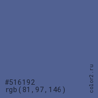 Цвет #516192 в цветовой модели RGB обозначается тремя октетами (81, 97, 146) в десятичном формате и #516192 в шестнадцатиричном (hex) формате, которые являются интенсивностью красного 81 (hex 51), интенсивность зелёного 97 (hex 61) и интенсивность синего 146 (hex 92).