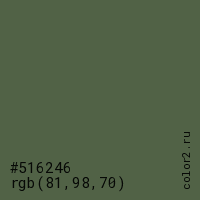 Цвет #516246 в цветовой модели RGB обозначается тремя октетами (81, 98, 70) в десятичном формате и #516246 в шестнадцатиричном (hex) формате, которые являются интенсивностью красного 81 (hex 51), интенсивность зелёного 98 (hex 62) и интенсивность синего 70 (hex 46).