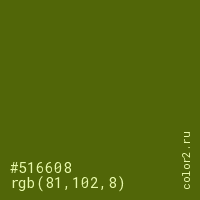 Цвет #516608 в цветовой модели RGB обозначается тремя октетами (81, 102, 8) в десятичном формате и #516608 в шестнадцатиричном (hex) формате, которые являются интенсивностью красного 81 (hex 51), интенсивность зелёного 102 (hex 66) и интенсивность синего 8 (hex 08).