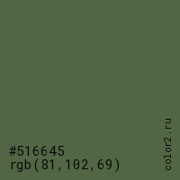 Цвет #516645 в цветовой модели RGB обозначается тремя октетами (81, 102, 69) в десятичном формате и #516645 в шестнадцатиричном (hex) формате, которые являются интенсивностью красного 81 (hex 51), интенсивность зелёного 102 (hex 66) и интенсивность синего 69 (hex 45).