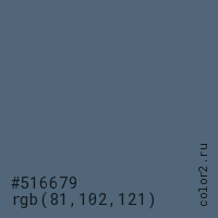 Цвет #516679 в цветовой модели RGB обозначается тремя октетами (81, 102, 121) в десятичном формате и #516679 в шестнадцатиричном (hex) формате, которые являются интенсивностью красного 81 (hex 51), интенсивность зелёного 102 (hex 66) и интенсивность синего 121 (hex 79).