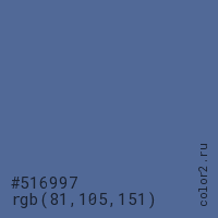 Цвет #516997 в цветовой модели RGB обозначается тремя октетами (81, 105, 151) в десятичном формате и #516997 в шестнадцатиричном (hex) формате, которые являются интенсивностью красного 81 (hex 51), интенсивность зелёного 105 (hex 69) и интенсивность синего 151 (hex 97).