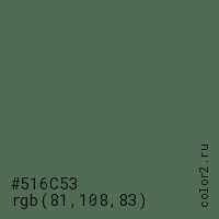 Цвет #516C53 в цветовой модели RGB обозначается тремя октетами (81, 108, 83) в десятичном формате и #516C53 в шестнадцатиричном (hex) формате, которые являются интенсивностью красного 81 (hex 51), интенсивность зелёного 108 (hex 6C) и интенсивность синего 83 (hex 53).