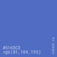 Цвет #516DC3 в цветовой модели RGB обозначается тремя октетами (81, 109, 195) в десятичном формате и #516DC3 в шестнадцатиричном (hex) формате, которые являются интенсивностью красного 81 (hex 51), интенсивность зелёного 109 (hex 6D) и интенсивность синего 195 (hex C3).
