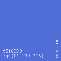 Цвет #516DD8 в цветовой модели RGB обозначается тремя октетами (81, 109, 216) в десятичном формате и #516DD8 в шестнадцатиричном (hex) формате, которые являются интенсивностью красного 81 (hex 51), интенсивность зелёного 109 (hex 6D) и интенсивность синего 216 (hex D8).