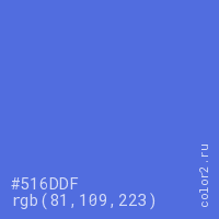 Цвет #516DDF в цветовой модели RGB обозначается тремя октетами (81, 109, 223) в десятичном формате и #516DDF в шестнадцатиричном (hex) формате, которые являются интенсивностью красного 81 (hex 51), интенсивность зелёного 109 (hex 6D) и интенсивность синего 223 (hex DF).