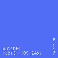 Цвет #516DF6 в цветовой модели RGB обозначается тремя октетами (81, 109, 246) в десятичном формате и #516DF6 в шестнадцатиричном (hex) формате, которые являются интенсивностью красного 81 (hex 51), интенсивность зелёного 109 (hex 6D) и интенсивность синего 246 (hex F6).