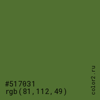 Цвет #517031 в цветовой модели RGB обозначается тремя октетами (81, 112, 49) в десятичном формате и #517031 в шестнадцатиричном (hex) формате, которые являются интенсивностью красного 81 (hex 51), интенсивность зелёного 112 (hex 70) и интенсивность синего 49 (hex 31).