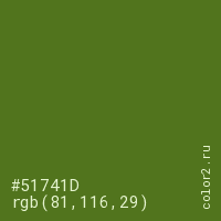 Цвет #51741D в цветовой модели RGB обозначается тремя октетами (81, 116, 29) в десятичном формате и #51741D в шестнадцатиричном (hex) формате, которые являются интенсивностью красного 81 (hex 51), интенсивность зелёного 116 (hex 74) и интенсивность синего 29 (hex 1D).