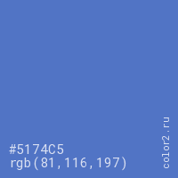 Цвет #5174C5 в цветовой модели RGB обозначается тремя октетами (81, 116, 197) в десятичном формате и #5174C5 в шестнадцатиричном (hex) формате, которые являются интенсивностью красного 81 (hex 51), интенсивность зелёного 116 (hex 74) и интенсивность синего 197 (hex C5).