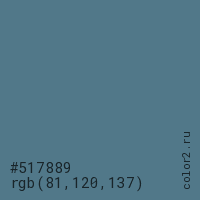 Цвет #517889 в цветовой модели RGB обозначается тремя октетами (81, 120, 137) в десятичном формате и #517889 в шестнадцатиричном (hex) формате, которые являются интенсивностью красного 81 (hex 51), интенсивность зелёного 120 (hex 78) и интенсивность синего 137 (hex 89).