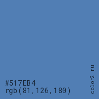 Цвет #517EB4 в цветовой модели RGB обозначается тремя октетами (81, 126, 180) в десятичном формате и #517EB4 в шестнадцатиричном (hex) формате, которые являются интенсивностью красного 81 (hex 51), интенсивность зелёного 126 (hex 7E) и интенсивность синего 180 (hex B4).