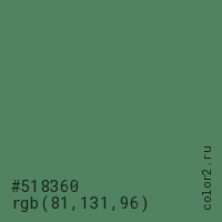 Цвет #518360 в цветовой модели RGB обозначается тремя октетами (81, 131, 96) в десятичном формате и #518360 в шестнадцатиричном (hex) формате, которые являются интенсивностью красного 81 (hex 51), интенсивность зелёного 131 (hex 83) и интенсивность синего 96 (hex 60).