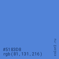 Цвет #5183D8 в цветовой модели RGB обозначается тремя октетами (81, 131, 216) в десятичном формате и #5183D8 в шестнадцатиричном (hex) формате, которые являются интенсивностью красного 81 (hex 51), интенсивность зелёного 131 (hex 83) и интенсивность синего 216 (hex D8).