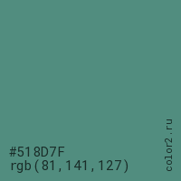Цвет #518D7F в цветовой модели RGB обозначается тремя октетами (81, 141, 127) в десятичном формате и #518D7F в шестнадцатиричном (hex) формате, которые являются интенсивностью красного 81 (hex 51), интенсивность зелёного 141 (hex 8D) и интенсивность синего 127 (hex 7F).