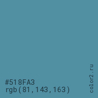 Цвет #518FA3 в цветовой модели RGB обозначается тремя октетами (81, 143, 163) в десятичном формате и #518FA3 в шестнадцатиричном (hex) формате, которые являются интенсивностью красного 81 (hex 51), интенсивность зелёного 143 (hex 8F) и интенсивность синего 163 (hex A3).