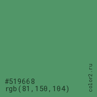 Цвет #519668 в цветовой модели RGB обозначается тремя октетами (81, 150, 104) в десятичном формате и #519668 в шестнадцатиричном (hex) формате, которые являются интенсивностью красного 81 (hex 51), интенсивность зелёного 150 (hex 96) и интенсивность синего 104 (hex 68).