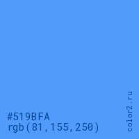 Цвет #519BFA в цветовой модели RGB обозначается тремя октетами (81, 155, 250) в десятичном формате и #519BFA в шестнадцатиричном (hex) формате, которые являются интенсивностью красного 81 (hex 51), интенсивность зелёного 155 (hex 9B) и интенсивность синего 250 (hex FA).